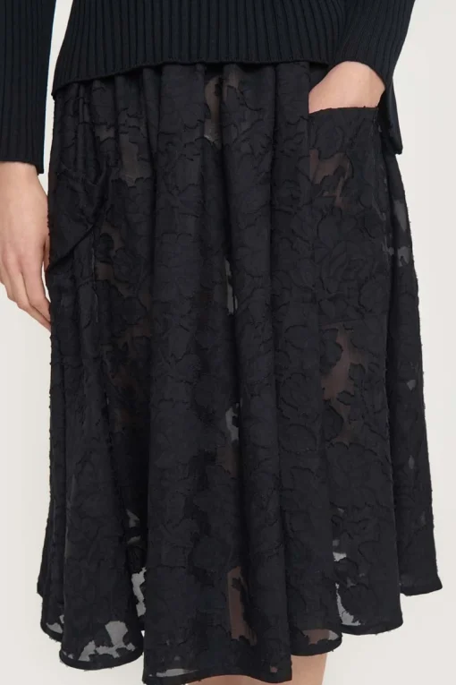 Smuk nederdel med blomstermønster i det lækreste stof, der er transparent, hvilket gør nederdelen både sensuel og eventyrlig. Der er masser af vidde i skørtet, og sammen med den elastiske linning skaber det en fantastisk flot silhuet. Brug nederdelen over fx tætsiddende bukser, korte shorts eller et underskørt. Du kan også bære den alene, så dine ben anes gennem stoffet.Modellen på billedet er 180 cm og iført str. SFuld længde i størrelse S, ca. 74 cm.