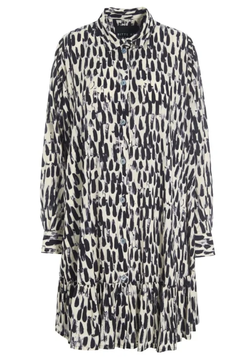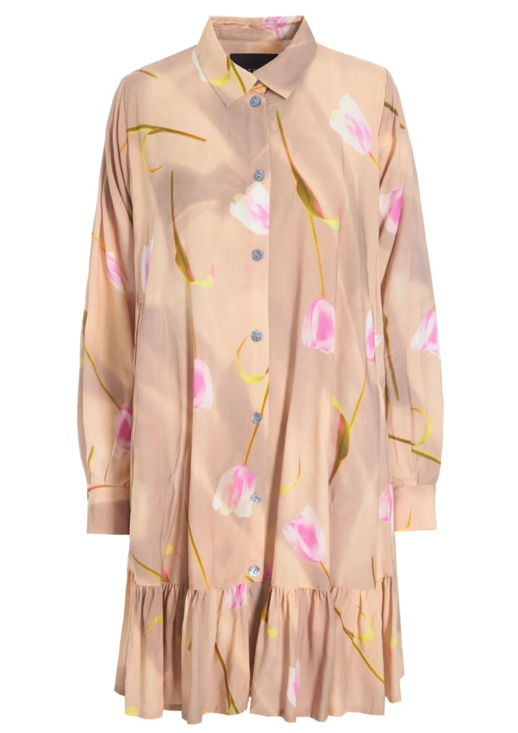 Det smukke print gør denne kjole til noget ganske særligt. Og den voluminøse A-form kombineret med flæsekanten giver sus i skørtet og gør kjolen egnet til såvel hverdag som sommerens fester tilsat iøjnefaldende øreringe og godt humør.Modellen på billede er 178 cm og iført str. SFuld længde i str. S, ca. 95 cm.