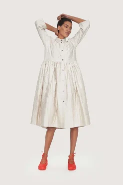 Denne smukke skjortekjole skiller sig ud på flere måder. Den er quiltet, let vatteret, og stoffets overflade er en anelse blankt, hvilket understreger kjolens festlige udtryk. Snittet er enkelt, og der er god vidde i skørtet. En skjortekjole, som vil gøre både hverdagen og festen mere elegant.Modellen på billede er 180 cm og iført str. SFuld længde i str. S, ca. 119 cm.