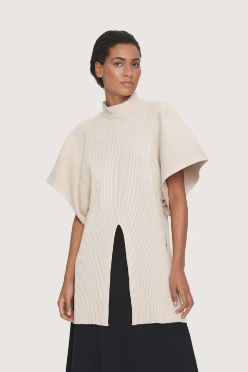 Denne ribstrikkede bluse har en yderst klædelig facon. Den lange længde, de bred ærmer og den høje slids giver et næsten tunikaagtigt udtryk og får blusen til at falde smukt om kroppen. Brug blusen med jeans, klassiske bukser eller nederdele.Modellen på billede er 180 cm og iført str. SFuld længde i str. S, ca. 84 cm.