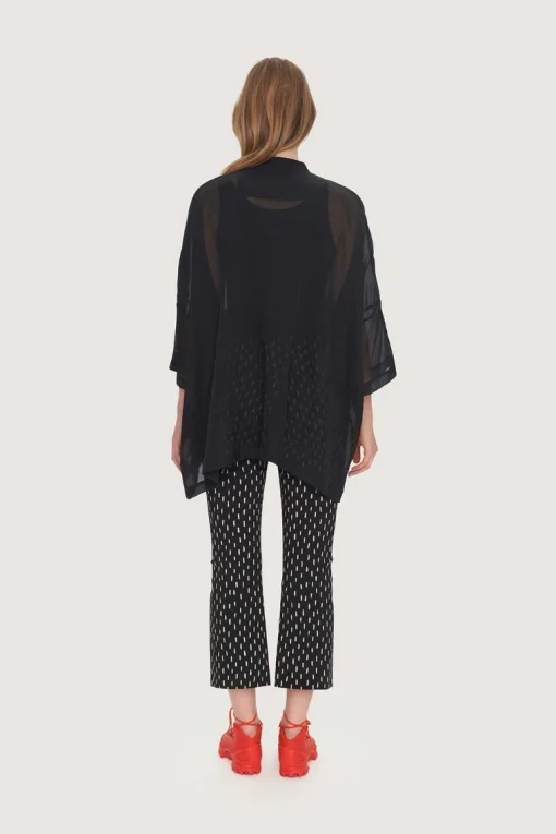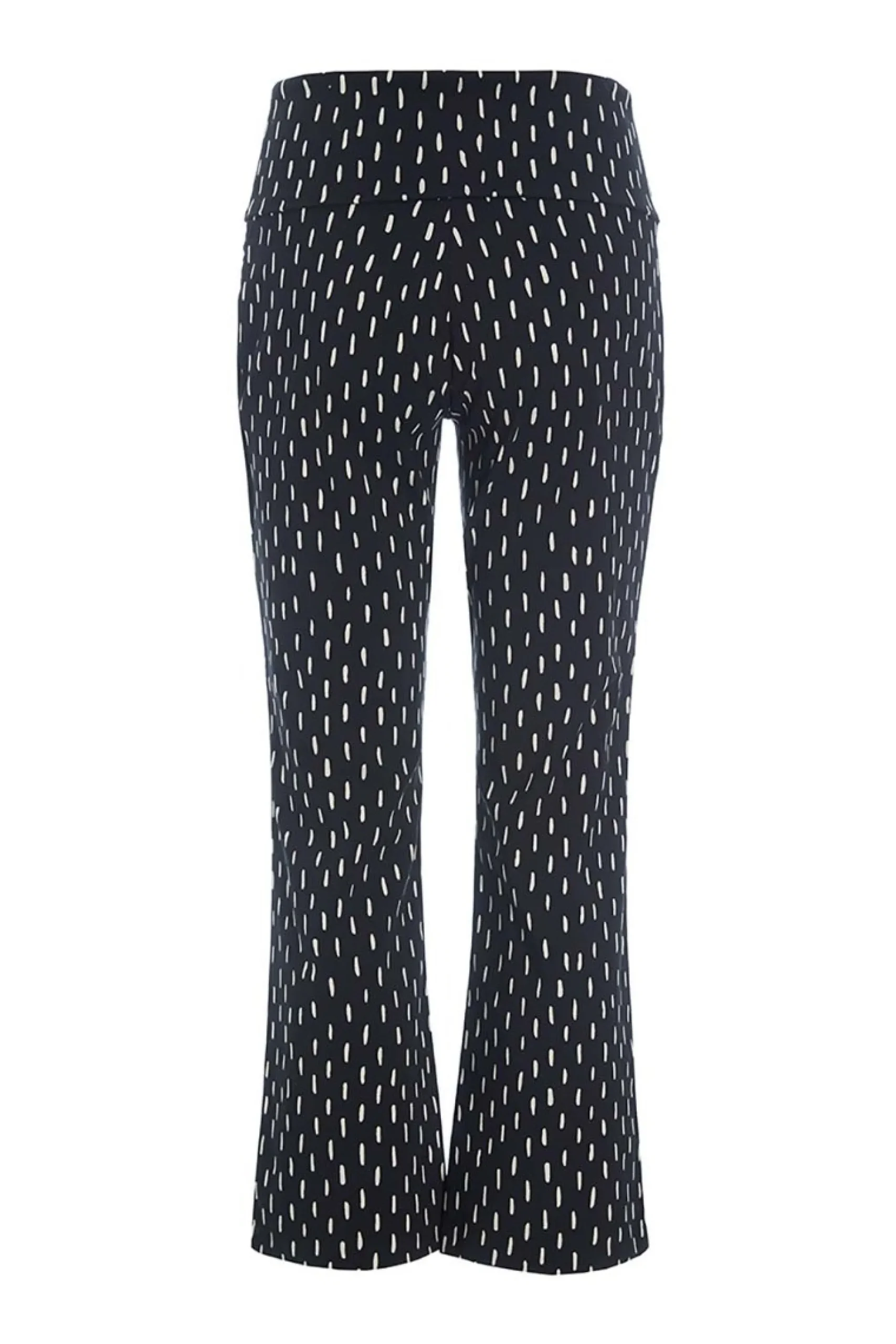 Bukser med et diskret sort/hvidt mønster, 3/4-længde, svaj forneden og bred linning, der kan trækkes op over maven eller foldes ned for en almindelig taljehøjde. Denne effekt gør bukserne meget behagelige. Der er stretch i stoffet, hvilket sikrer en god bevægelighed.Modellen på billede er 180 cm og iført str. SLængde målt fra taljen i str. S: ca. 94 cm.