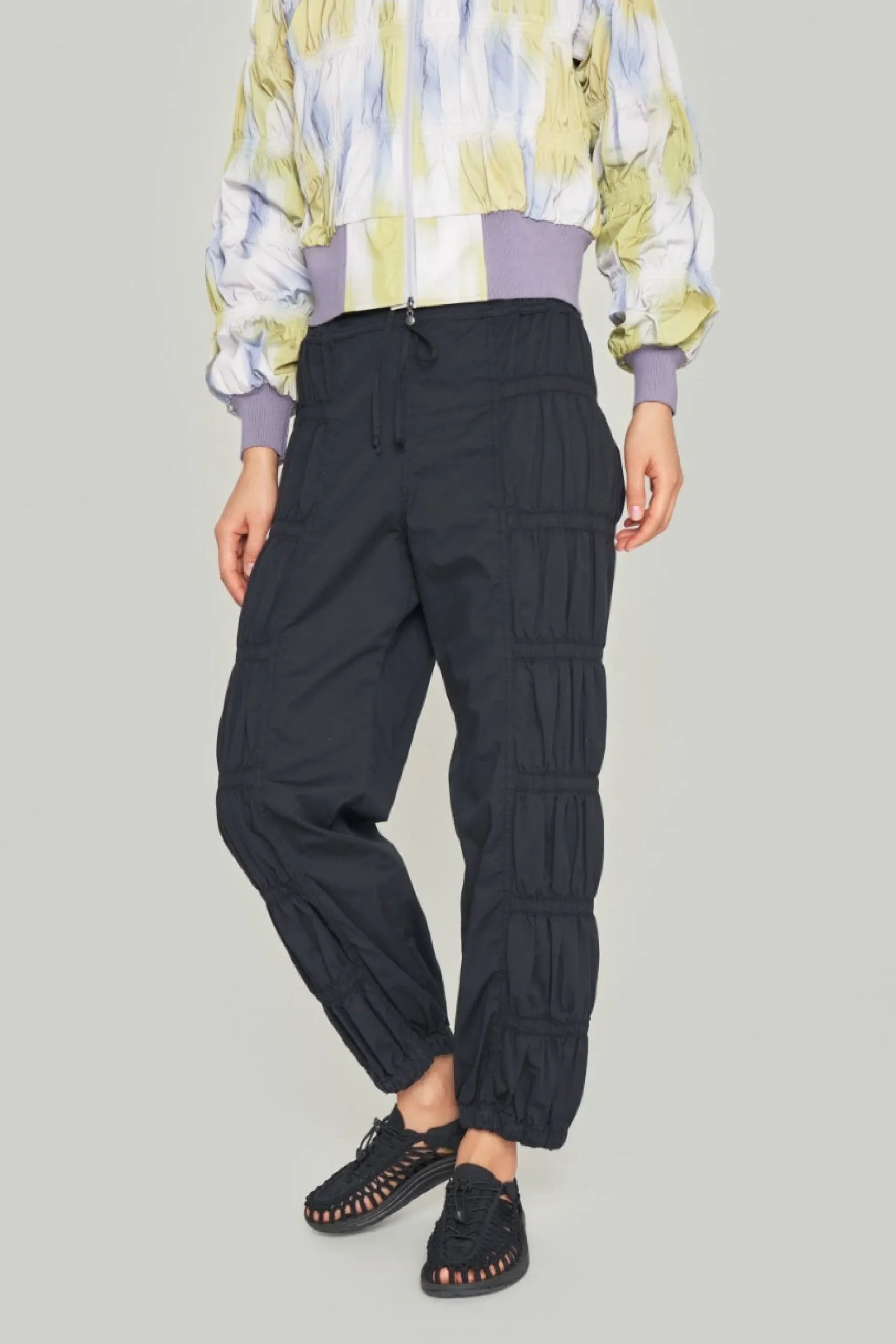 Bukser med elastisk rynkeeffekt på benene, hvilket skaber en på Ún gang afslappet og skulpturel silhuet. Med disse bukser behøver du ikke andet end en enkel t-shirt og et par ballerinasko eller sandaler, så har du et elegant og klædeligt outfit, der er yderst behageligt at have på.Modellen på billede er 178 cm og iført str. SLængde målt fra taljen i str. S: ca. 102 cm.