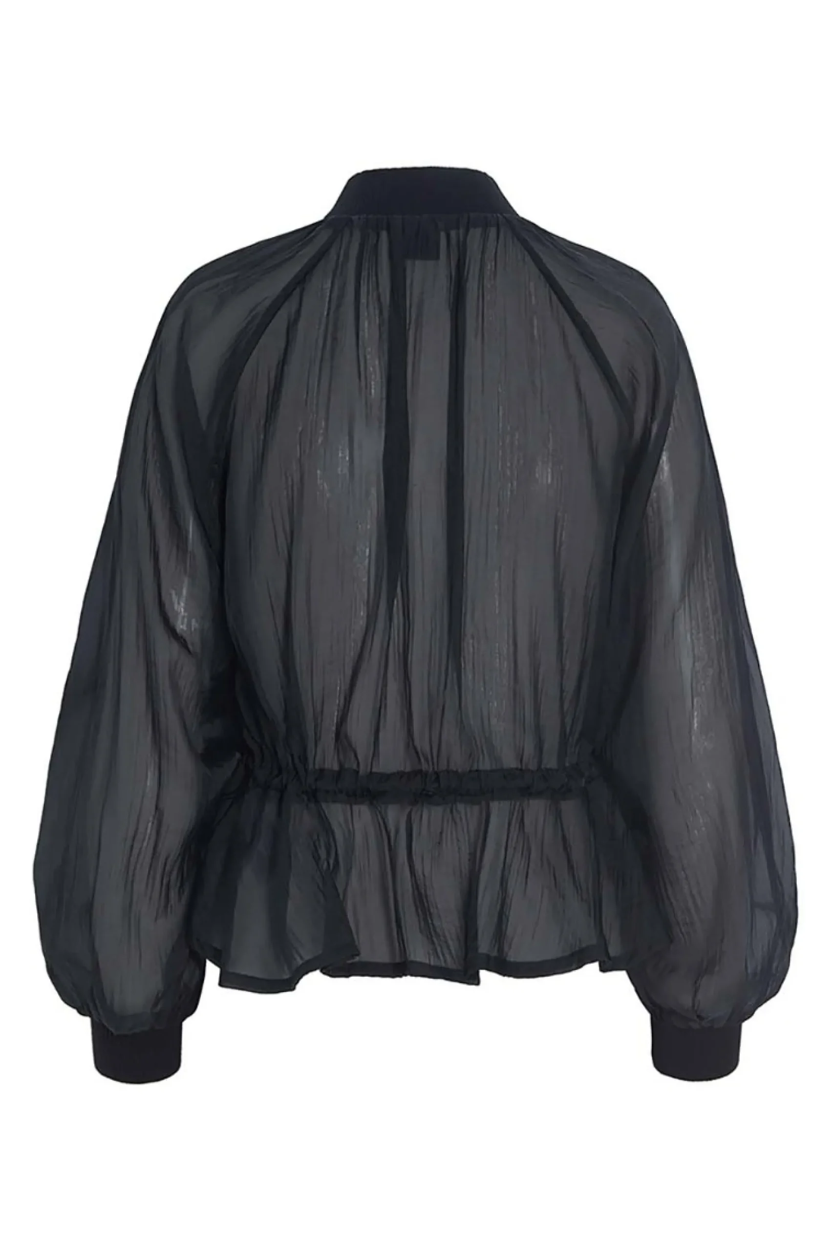 Elegant og transparent bluse med justerbar elastik i livet, hvilket skaber en flot markering af taljen. Blusen har voluminøse ærmer, og det lette materiale falder smukt. Brug blusen med en top under, eller lad dit lingerie komme til syne gennem det lette materiale.Modellen på billede er 180 cm og iført str. SFuld længde i str. S, ca. 54 cm.