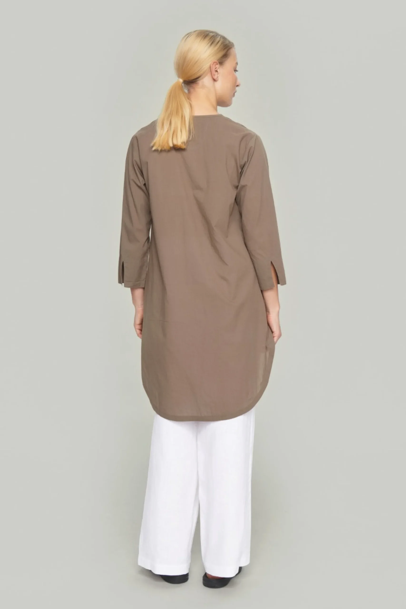 Enkel skjorte med rundet for- og bagstykke, hvilket giver en lethed til designet. Skjorten kan fx bruges til jeans, bukser med brede ben eller en maxinederdel.Modellen på billede er 178 cm og iført str. SFuld længde i str. S, ca. 94 cm.