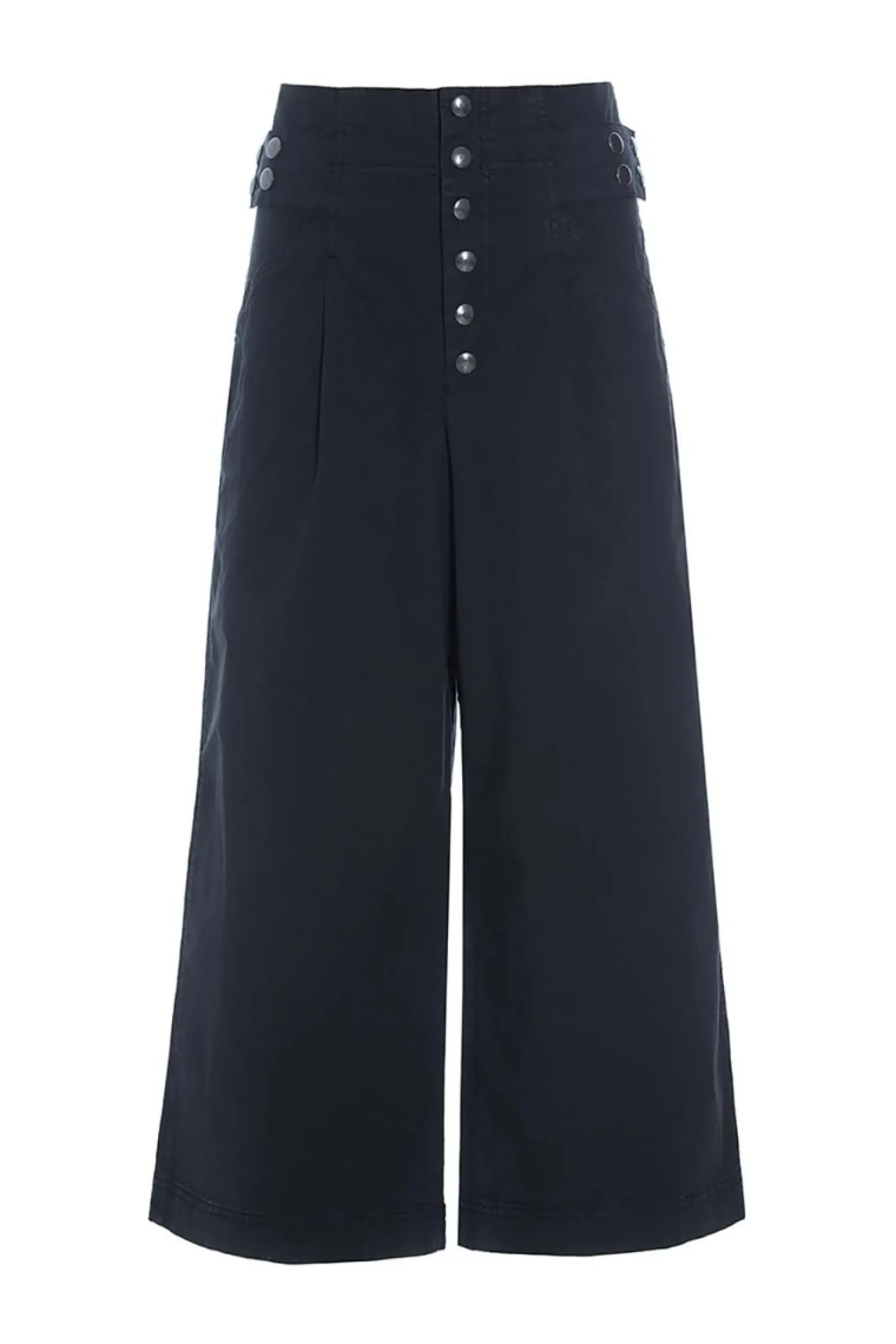 Ved hjælp af knapperne i taljen justeres den lave cool talje til en høj stilren paperbag talje. Bukserne er 3/4-lange, hvilket giver en lethed til designet. Brug bukserne med en knitrende hvid skjorte, sæt en lækker sweater til, eller skab et smukt sæt ved at kombinere bukserne med Wabi jakken med bindebånd.Modellen på billede er 180 cm og iført str. SLængde målt fra taljen i str. S: ca. 94 cm.