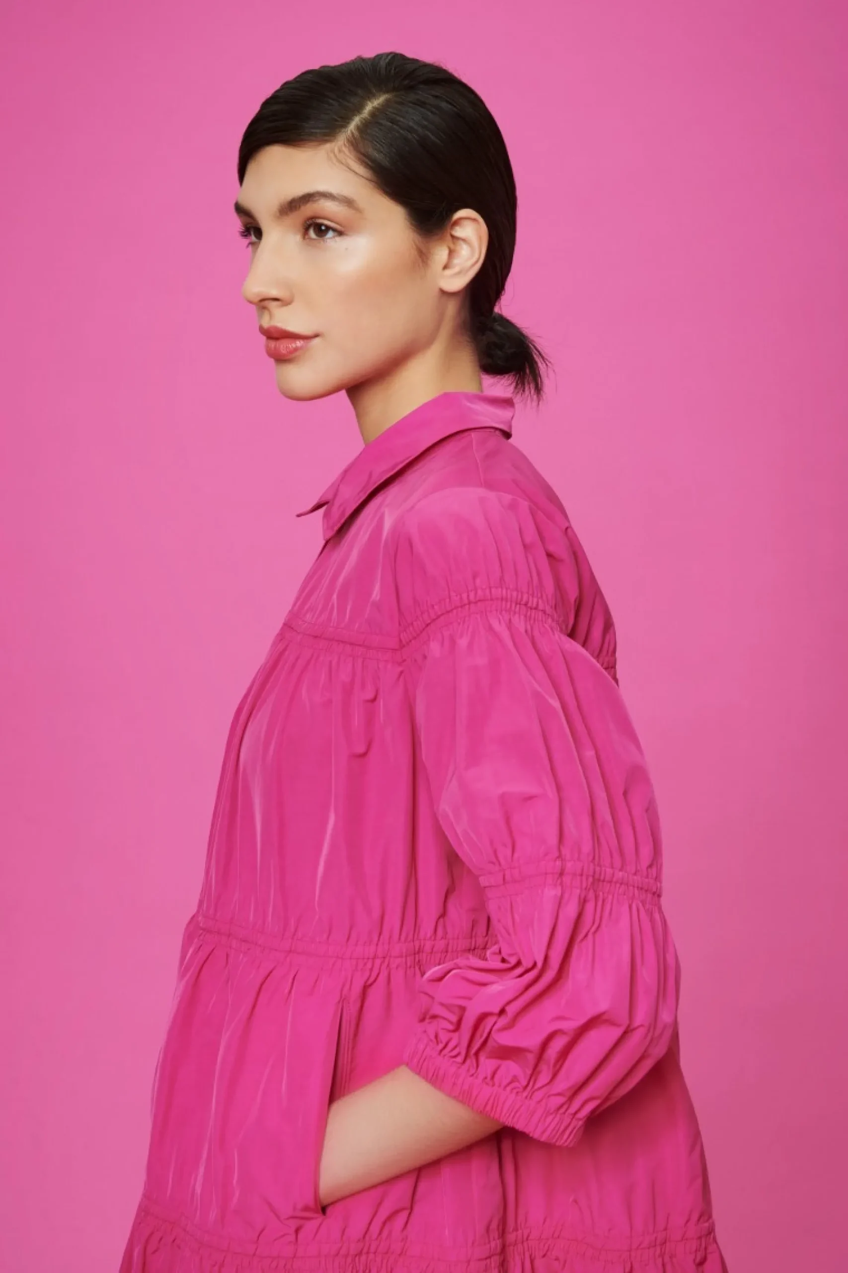 Flot kjole syet i paneler med rynkeeffekt, der giver et voluminøst udtryk. Kjolen er cool blot tilsat herresko eller ballerinaer. Og opgraderer du med høje hæle, er du lynhurtig klar til en aften i byen.Modellen på billede er 179 cm og iført str. SFuld længde i str. S, ca. 99 cm