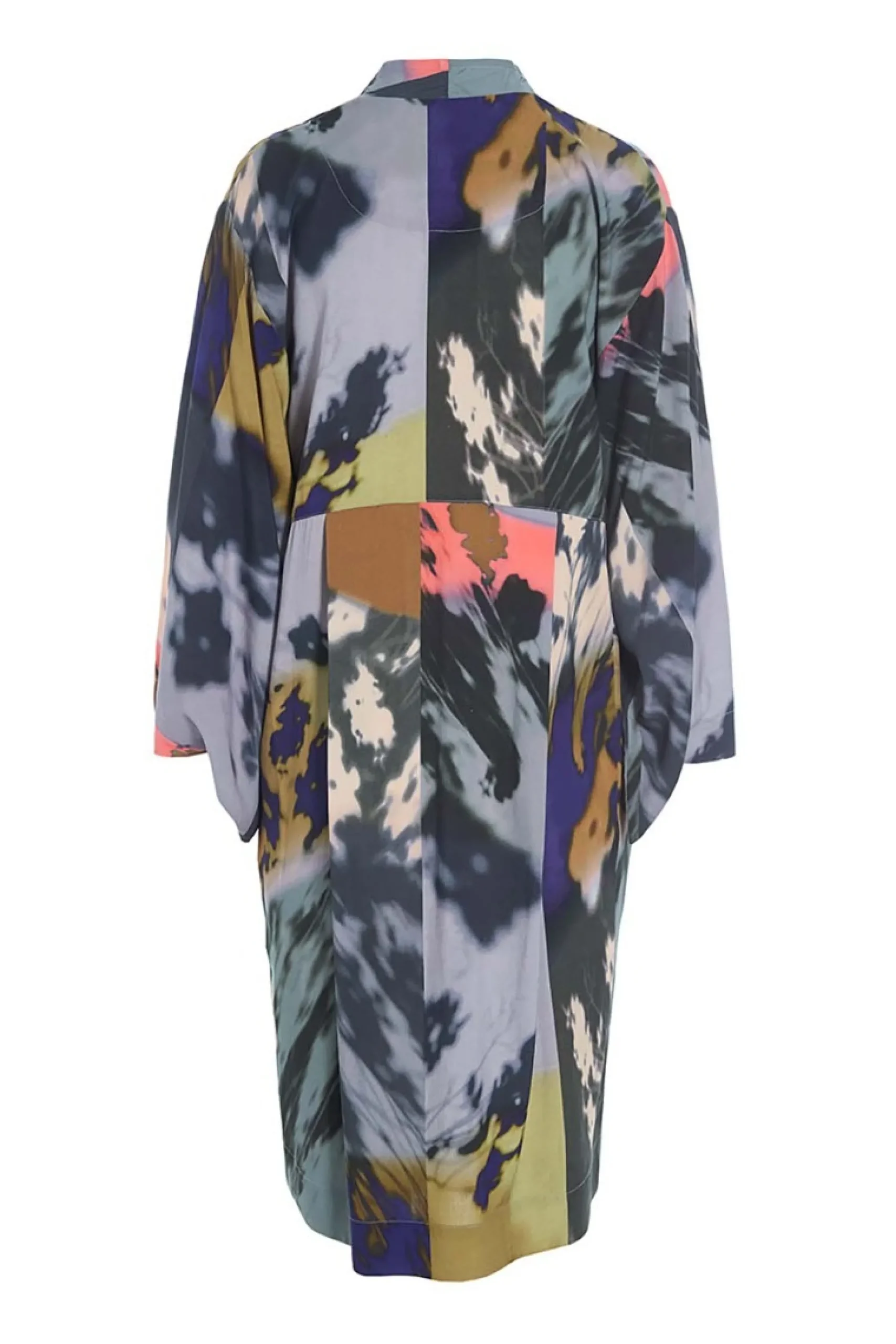 Kimonokjole med tydeligt orientalsk præg og brede kimonoærmer. Kimonokjolen er produceret i en lækker, blød, FSC-certificeret viskose, der gør den let og luftig at have på. Det kunstfærdige collage print i smukke nuancer vil føje et grafisk islæt til garderoben. Kimonokjolen er smuk i al sin enkelthed – du behøver ikke accessories. På kølige dage kan du tage en rullekravebluse under.Modellen på billede er 180 cm og iført str. SFuld længde i str. S, ca. 104 cm.