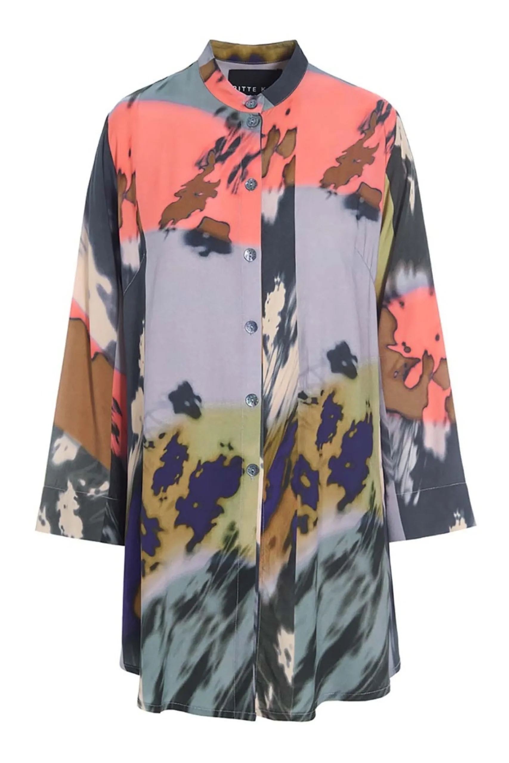 En skjorte, som har et enkelt, velsiddende snit og et kunstfærdigt collage print i smukke nuancer. Skjorten er produceret i en lækker, blød, FSC-certificeret viskose, der gør den let og luftig at have på. Skjorten gør sig godt under en vest eller blazer såvel som alene, sat til et par elegante bukser.Modellen på billede er 180 cm og iført str. SFuld længde i str. S, ca. 84 cm.