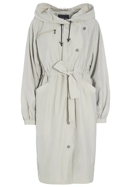 Denne frakke er et virkelig lækkert bud på overtøj til de kølige forårsdage. Du undgår kolde ører, for hætten slutter godt til. Det samme gør ærmerne – ingen kold vind slipper ind. Bæltet i taljen giver en flot og slank silhuet.Modellen på billede er 174 cm og iført str. SFuld længde i str. S, ca. 109 cm.