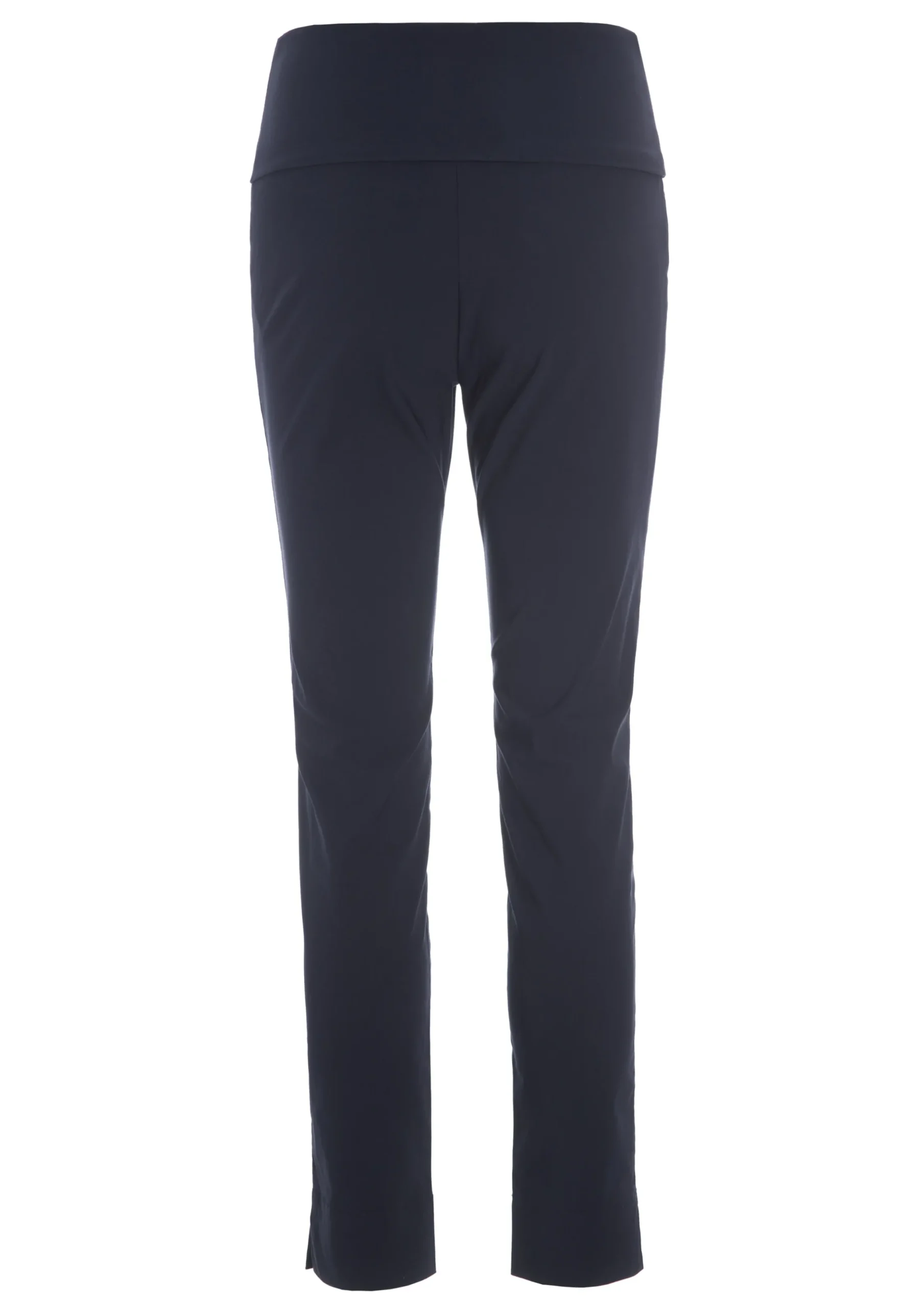 Vores populære basisbukser med tætsiddende pasform og stretch, som sikrer en god bevægelighed. Buksernes brede linning kan trækkes op over maven eller foldes ned for en almindelig taljehøjde. Denne effekt gør dem meget behagelige. Der er en lille slids nederst på buksebenene.Modellen på billede er 176 cm og iført str. S A Længde i str. S, ca. 89 cm. B Længde i str. S, ca. 95 cm.