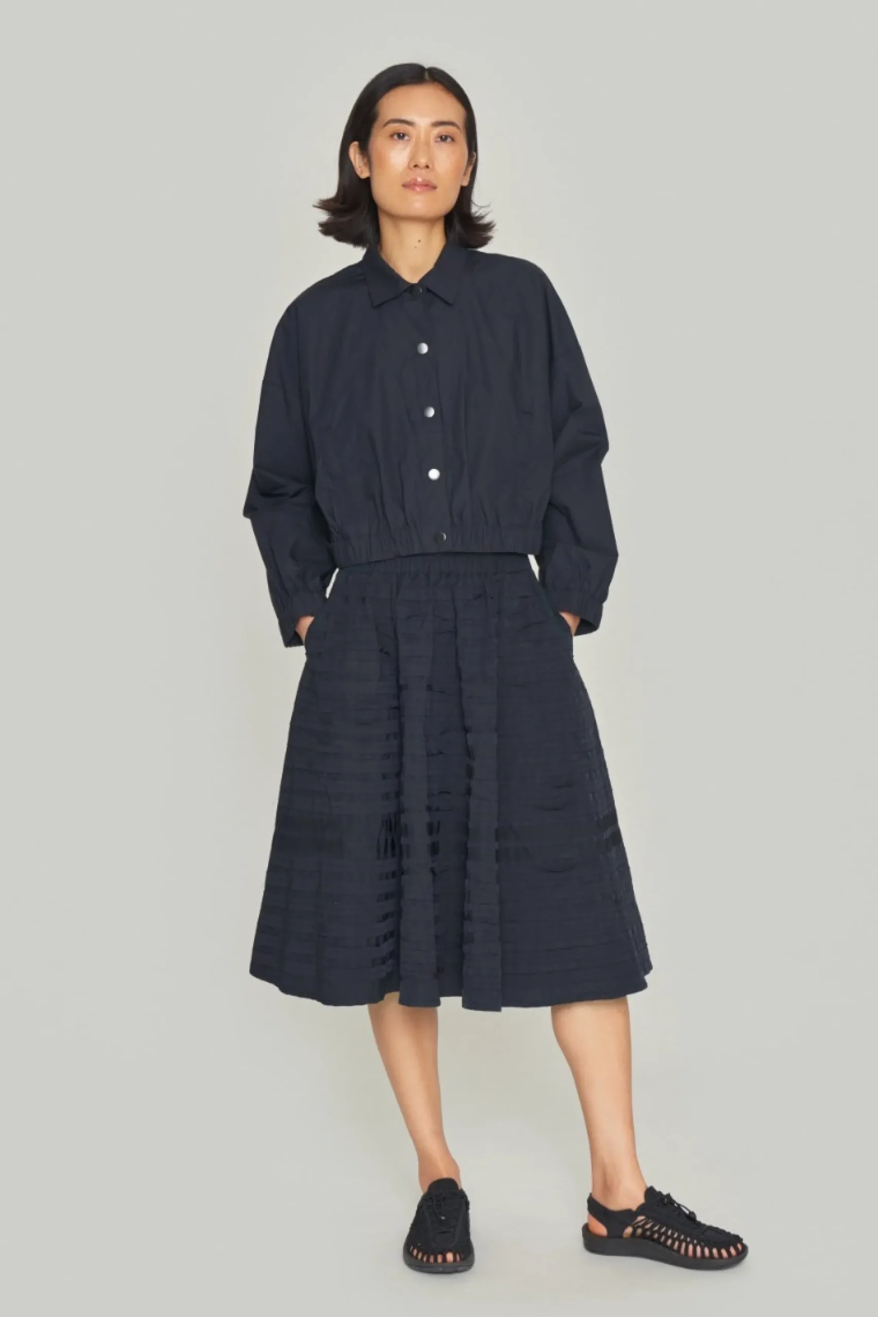 Lækker kort jakke, der har trykknapper og elastik i taljen, hvilket giver en feminin silhuet. Brug jakken som et friskt alternativ til en blazer, eller lav et lækkert sæt ved at kombinere den med de matchende Paper Poplin bukser.Modellen på billede er 178 cm og iført str. SFuld længde i str. S, ca. 49 cm.