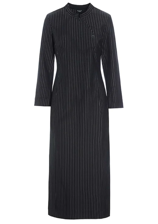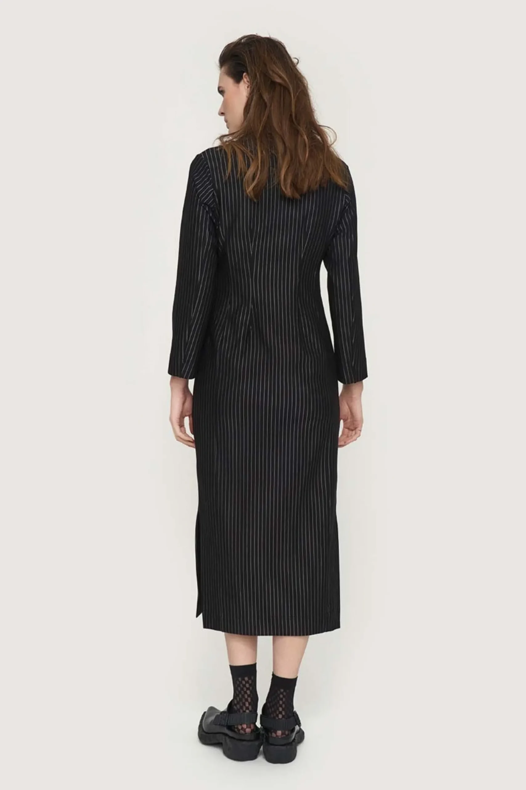 Smuk og superenkel kjole med kinakrave, asymmetrisk lukning og nålestriber, der forener det orientalske med et klassisk business look. Kjolen har en lang, slank silhuet, og stoffet er tilsat stretch for god bevægelighed. En tidløs klassiker, som kan bruges både til hverdag og fest.Modellen på billede er 180 cm og iført str. SFuld længde i str. S, ca. 130 cm.