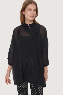 Bukser med et diskret sort/hvidt mønster, 3/4-længde, svaj forneden og bred linning, der kan trækkes op over maven eller foldes ned for en almindelig taljehøjde. Denne effekt gør bukserne meget behagelige. Der er stretch i stoffet, hvilket sikrer en god bevægelighed.Modellen på billede er 180 cm og iført str. SLængde målt fra taljen i str. S: ca. 94 cm.