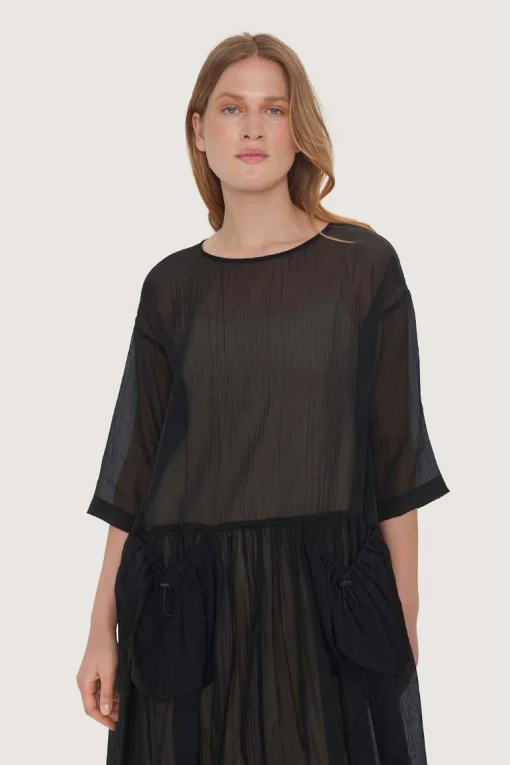 Transparent og luftig kjole med et flot, voluminøst snit. Den kan styles på et utal af måder. Brug den fx med en kropsnær stropkjole eller top og bukser under. Du kan også lege med at lade farverigt tøj skinne igennem det lette stof.Modellen på billede er 180 cm og iført str. 1Fuld længde i str. 1, ca. 108 cm. Fit: Oversize